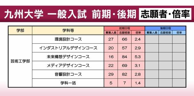 【九州大学】一般入試の志願者数・倍率(前・後期) 前期の倍率は文学部2.4倍・法学部2.7倍・経済学部3.2倍・理学部2.4倍・医学部2.1倍・工学部2.0倍・農学部2.9倍 2026年2月13日(金) 17:43 国内 芸術工学部(全コース・前期)3.1倍 【画像で確認】九州大学 一般入試の志願者数・倍率 全学部(前・後期)