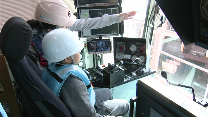 浚渫船は、海底の土砂を取り除く作業船で、子供たちは実際に操縦席に座ったり船内を見て回ったりして楽しんでいました。