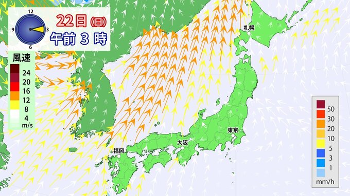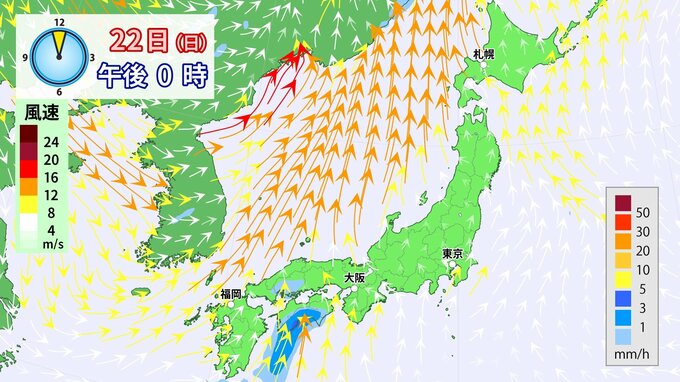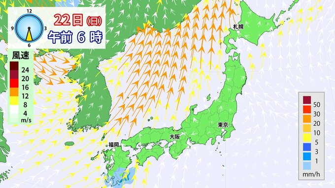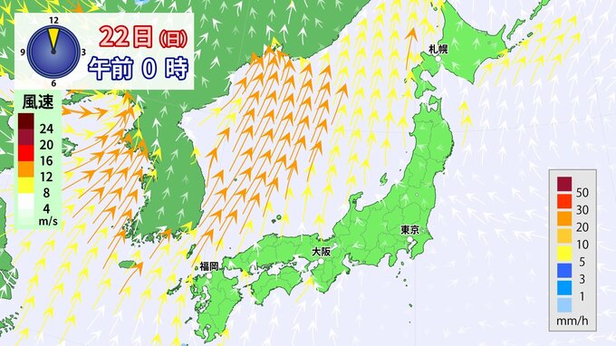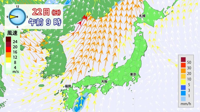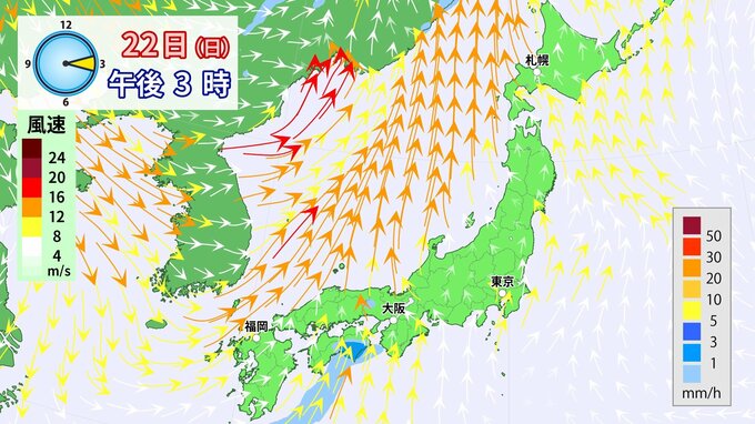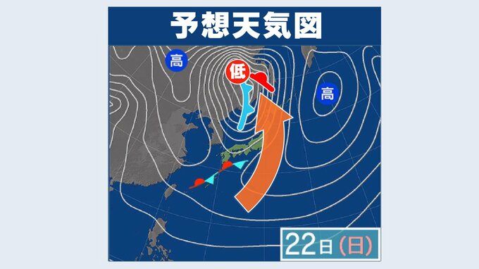 22日(日)は低気圧が発達しながら日本海を通過することで、列島に南風が流れ込み、気温が上昇する見込みです。