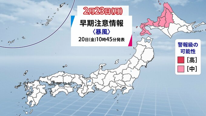 また、23日は北日本で大荒れの天気となる可能性があります。北海道は警報級の暴風が吹くおそれがあります。