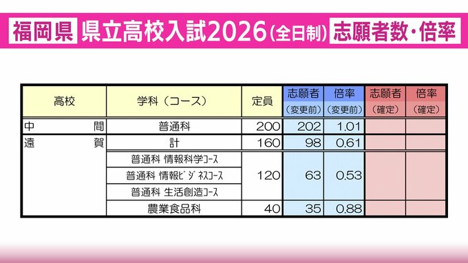 【全校掲載】福岡県立高校(北九州地区) 2026年一般入試の志願者数・倍率 東筑1.35倍・小倉1.20倍・八幡0.98倍・戸畑1.20倍 2026年2月20日(金) 21:31 国内 中間・遠賀の志願者数と倍率