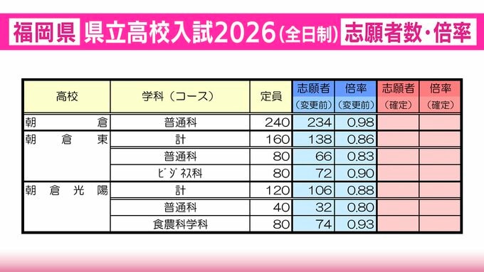 【全校掲載】福岡県立高校(筑後地区) 2026年一般入試の志願者数・倍率 明善1.34倍・久留米1.23倍・伝習館1.31倍・八女1.00倍 2026年2月20日(金) 21:30 国内 朝倉・朝倉東・朝倉光陽の志願者数と倍率