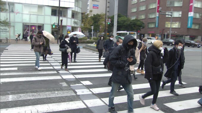 RKB吉松真希「福岡市天神です。非常に冷たい風が吹いています。しっかり防寒して足早に出勤する人の姿が見受けられます」