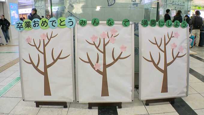 駅には、桜の木を模したメッセージボードも。