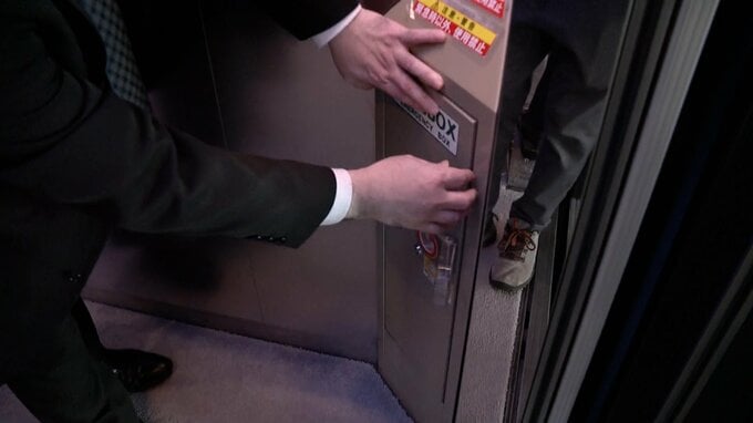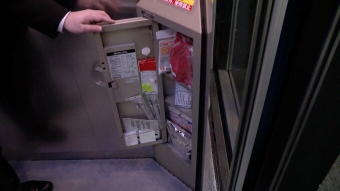 そして、このフロアに止まることができず、しばらく閉じ込められた場合、助けが来るまでの備えとしてエレベーター内の隅に設置されているのが、「防災備蓄キャビネット」です。