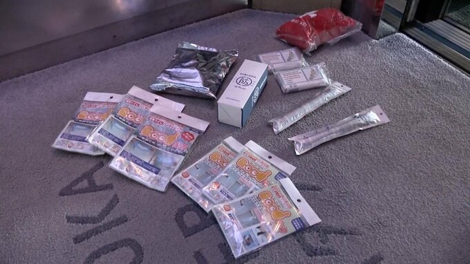 「こちらが水ですね、こちらが非常食になります」