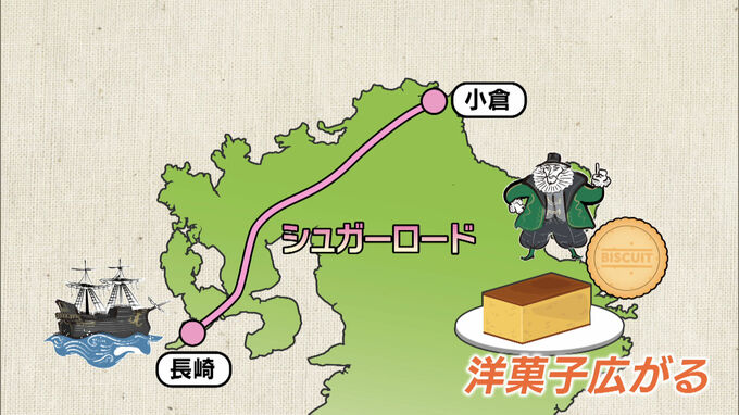 当時、長崎の出島に伝わった洋菓子が『シュガーロード』と呼ばれる長崎街道を通って運ばれ、広まっていきました。
