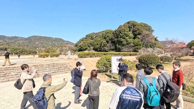 3チームに分かれ、旅行会社や福岡市の観光協会など観光業の関係者を対象に大宰府政庁跡のガイドを行いました。