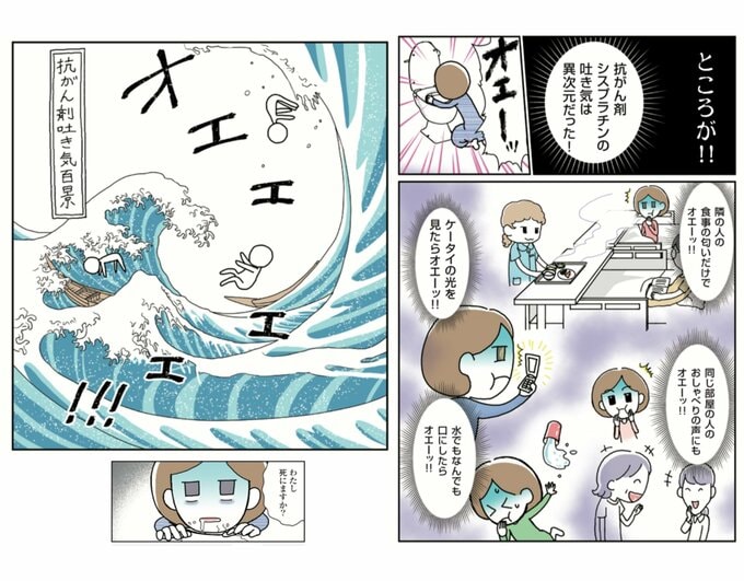 「抗がん剤(シスプラチン)の副作用です。私、お酒が大好きだったので『二日酔いの吐き気には強いぞ』なんて思っていたんです。でも、全然違いました。異次元の吐き気なんです。ご飯の匂いだけで吐く、隣の人が話しているだけで吐く。5時間も『ウエッ』とやり続けると、腹筋も背筋も壊れて、座っていられなくなるんです。トイレの床に顔をべったりつけたまま吐き続ける私は、先生にこう聞きました。『先生、嘔吐で死ぬ人っていますか?』って。それくらいキツかったんです」