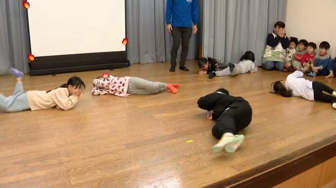 「衣服に火が燃え移ったと想定して子どもたちが転がりながら火の消し方を学んでいます」