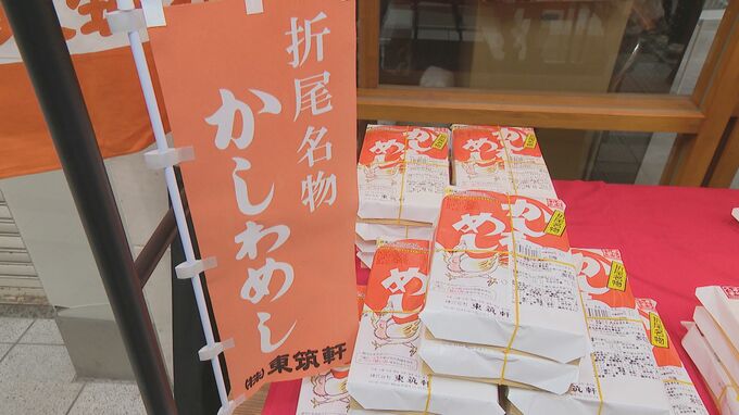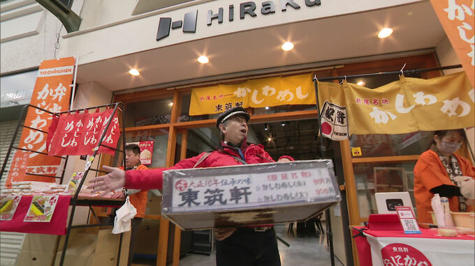 JR折尾駅の名物となっている「かしわめし」の弁当の立ち売りが福岡市天神で行われています。