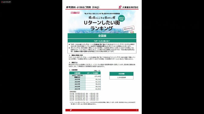 「Uターンしたい街ランキング」は、2021年から2025年までの5年間で、全国で出身地を離れて暮らす47万人あまりを対象として「出身地に戻りたいか」を聞いたものです。