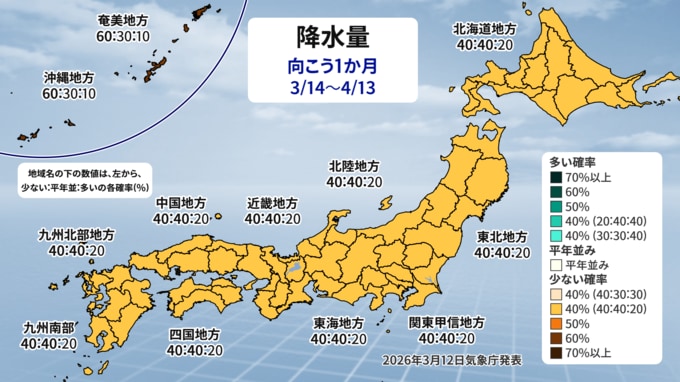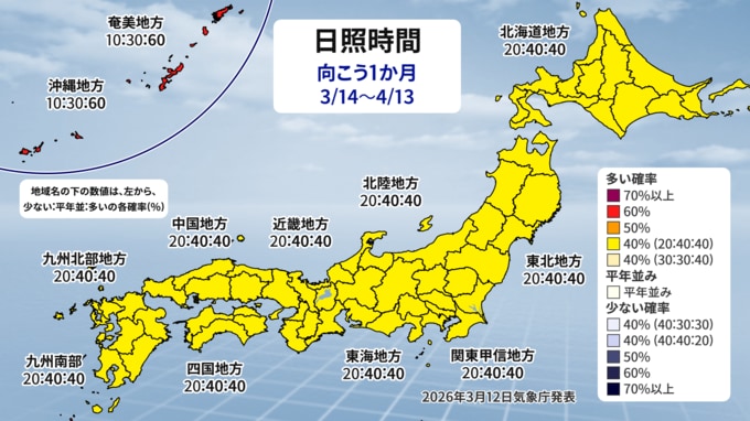 全国的に降水量は「平年並みか少なく」、日照時間は「平年並みか多く」なるでしょう。