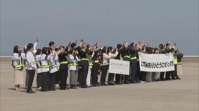 16日は飛び立つ機体を社員が手を振って見送り節目の日を祝いました。
