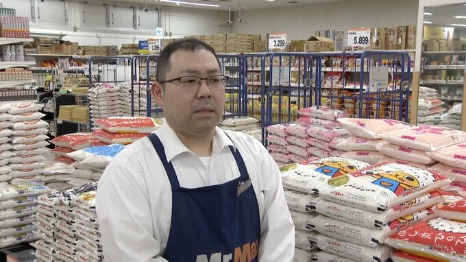 「こちらお店のお米売り場なんですが、今のお米の価格をみてみますと、こちらの県産米は、5キロで税込み3994円となっています。多くの商品が今、4000円を切っているような状況です」