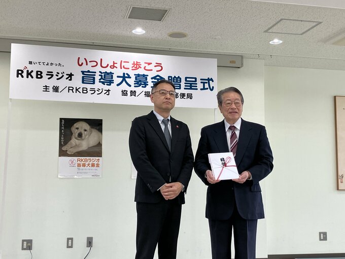 3月19日午前11時から、福岡県糸島市にある九州盲導犬協会の訓練センターで贈呈式が開かれました。RKBラジオが呼びかけ、昨年4月からの1年間で集まったおよそ217万円の募金が協会へ贈られました。