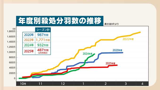 今年度は去年10月に北海道の養鶏場で鳥インフルエンザが発生して以降、関東や東北を中心に506万羽が殺処分されています。