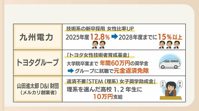 トヨタグループは「女性技術者育成基金」を設立し、大学院卒業までの最長6年間、年間で60万円の奨学金を支給。