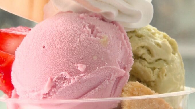 ストロベリーとピスタチオのジェラートの上にはふんわりとした生クリームをトッピング、春を感じる映えスイーツです!