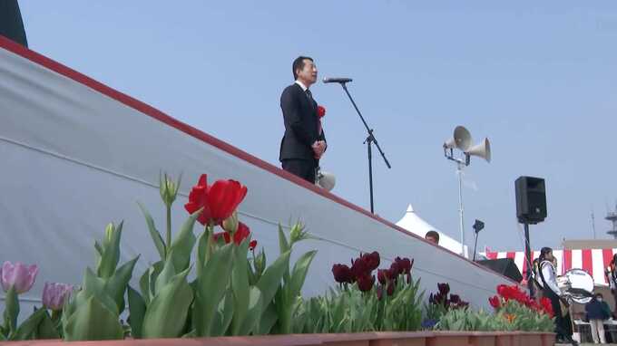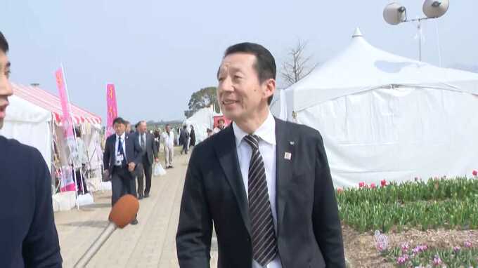 色鮮やかなチューリップの前で海外視察の成果をアピールする、福岡県議会の香原前議長。