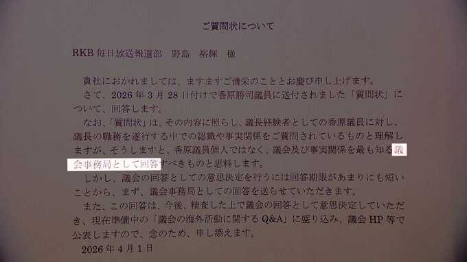 調査班は香原前議長に対し「実際に要人などと面会したことがあるのか?」など、詳細について質問状を送付。
