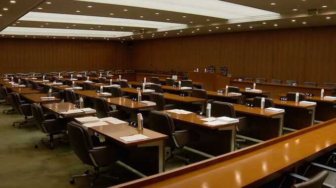 「会議室では予算特別委員会が予定されていますが、お昼をまわっても人の姿はなく始まる気配はありません」