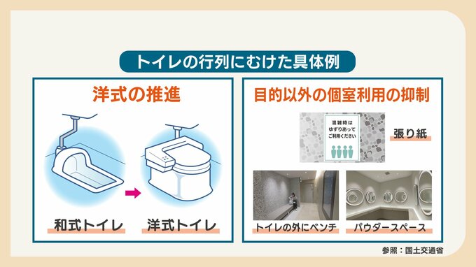 個室内にマナー向上の張り紙をする、また、パウダースペースを作る。そしてトイレの外にベンチを置き、荷物の整理ができるスペースを設けるなどの対策が有効だということです。