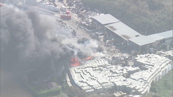 「黒煙が立ち上り激しい炎が・・・」産廃処理会社から出火 8時間半後にほぼ消し止められる けが人なし 福岡 2026年4月5日(日) 18:01 国内 5日午後、福岡県岡垣町の産業廃棄物処理会社から出火しました。火はおよそ8時間半後にほぼ消し止められました。●山本徹カメラマン「黒煙が立ち上り激しい炎が見えます、消防による放水が続いていますが炎の勢いは…