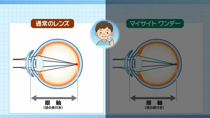 通常、メガネやコンタクトで視力を補正した場合、網膜の中心にピントが合い、その周辺ではピントが後ろにずれてしまいます。
