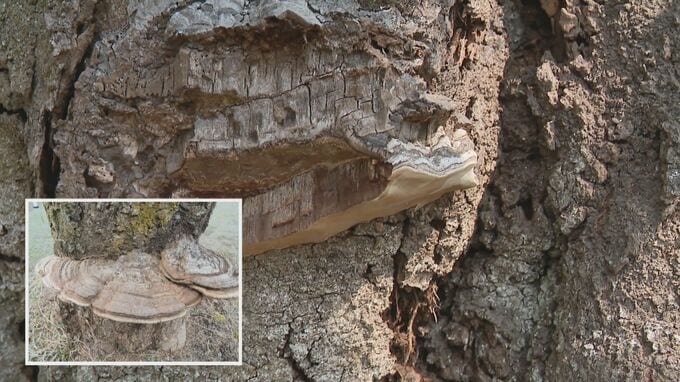 こちらの画像はすでにキノコ・サルノコシカケが取り除かれているのですが、こうしたキノコが木を腐らせる要因になっているということです。