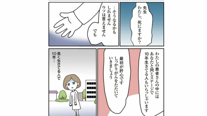 「率直に自分の主治医に聞いたんです。『私、死にますか?』って。そしたら主治医は、お医者さんは嘘をつけないので、『はい、死ぬこともあります』と。ただ『僕の患者さんの中に、同じくらいのステージで10年生きている人もいらっしゃるので一緒に治療を頑張りましょう』と」