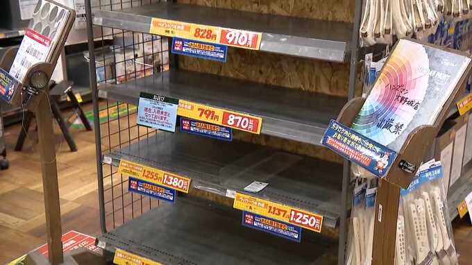 福岡県大野城市にあるホームセンター「ハンズマン」です。中東情勢の影響を受け、商品棚の一部に空白が目立っていました。