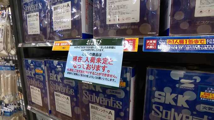 3月中旬から品薄になっているのが、塗料を薄める際などに使うシンナーです。