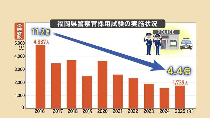 前職は…パティシエ、保育士、消防士 福岡県警が力を入れる社会人経験者の”警察官”採用 背景に何が 2026年4月21日(火) 20:14 国内 福岡県警の採用試験 受験者数は3分の1に減少 福岡県警によりますと採用試験の受験者数はこの10年でおよそ3分の1にまで減少。競争倍率も半分以下に落ち込んでいます。