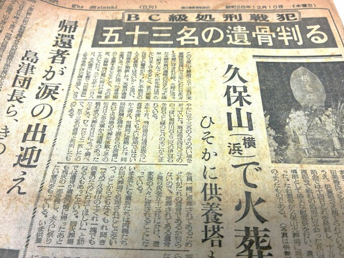 スガモプリズン最後の処刑で命を絶たれた山形市出身の幕田稔大尉。31歳の息子を奪われた母トメは、自宅に多くの資料を残していた。戦犯関係の記事が載った新聞の束の中に、1953年12月10日の毎日新聞朝刊があった。遺骨が取り出される4日前、「BC級処刑戦犯 五十三名の遺骨判る」のタイトルで記事が掲載されていた。