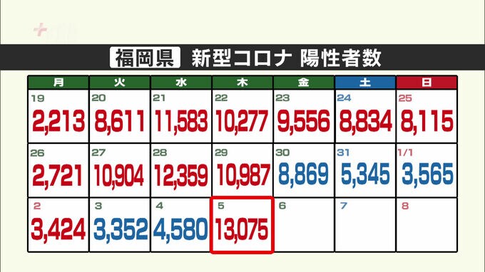 新型コロナ 死亡者は過去最多の29人 新たに1万3075人陽性 2023年1月5日(木) 23:59 国内 新型コロナウイルスについて福岡県は、5日1万3075人の陽性を発表しました。亡くなった方は過去最多の29人です。陽性者の数を示すカレンダーです。年末年始に休診していた医療機関が通常どおりの診察を…