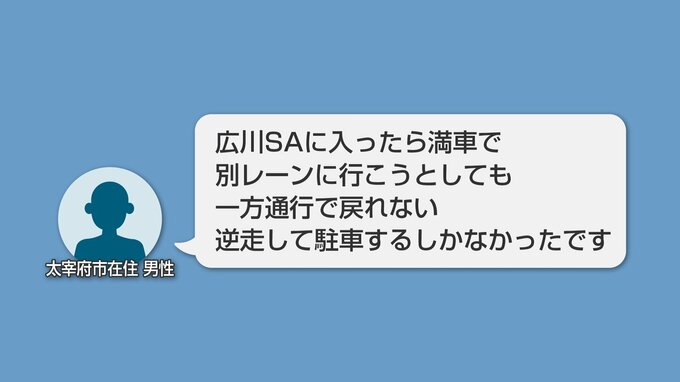 「広川SAに入ったら全部満車で、別のレーンに行こうとしても一方通行で戻れない。逆走して駐車するしかなかったです」