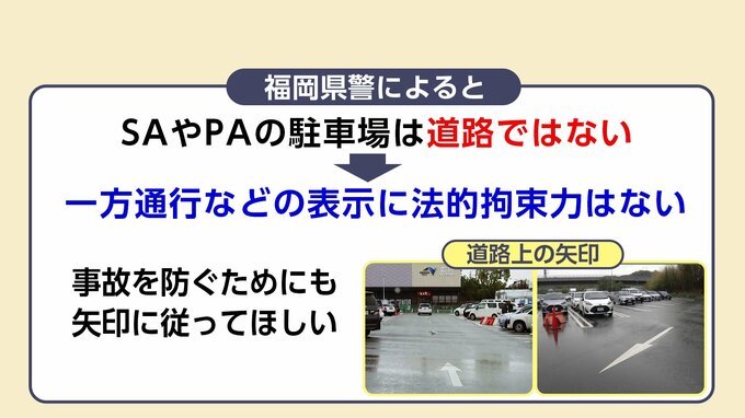 警察によりますと駐車場内の一方通行などの表示は、道路交通法上の「法定標識」ではないため、原則として法的拘束力はありません。