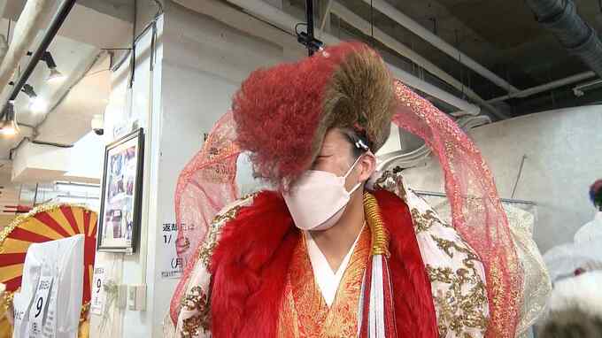 ド派手な衣装を一手に引き受けているのがレンタル衣装店の「みやび」。今年も早朝から多くの若者が着付けを行った。中でもひと際目立っていたのが羽衣付きの赤い衣装に身を包んだ八田宗一郎さんだ。力を注いだのは、赤いモヒカンだという。