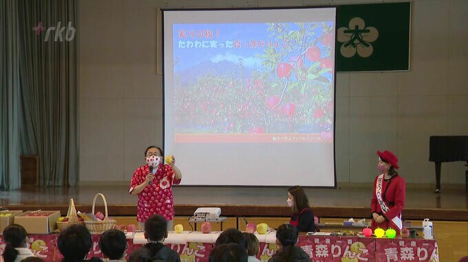 この授業は、子供たちにもっとりんごを食べてもらおうと青森県が全国各地で開催していて、三村知事はりんごの品種や生産方法、栄養などについて分かりやすく紹介しました。