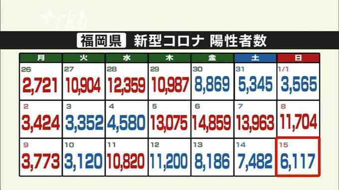 新型コロナ 福岡6117人 佐賀1067人陽性 2023年1月16日(月) 08:22 国内 新型コロナウイルスについて、福岡県は15日、新たに6117人の陽性を発表しました。福岡県の1日ごとの陽性者数を示すカレンダーです。15日は、先週の日曜日よりも5500人以上減っていて、4日連続で…