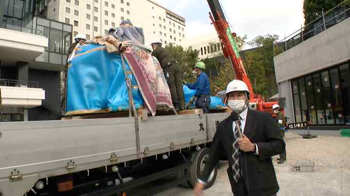 RKB三浦良介「福岡大名ガーデンシティに、大狛犬が到着しました。これから設置作業が行われます」