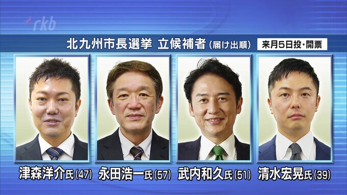 北九州市長選挙に立候補しているのは、届け出順に▼元国土交通省官僚の津森洋介氏(47)、▼共産党福岡県委員会常任委員の永田浩一氏(57)、▼元厚生労働省官僚の武内和久氏(51)、▼飲食店・デザイン会社経営の清水宏晃氏(39)の4人です。北九州市長選挙は2月5日に投票と開票が行われます。期日前投票は前日の4日までです。