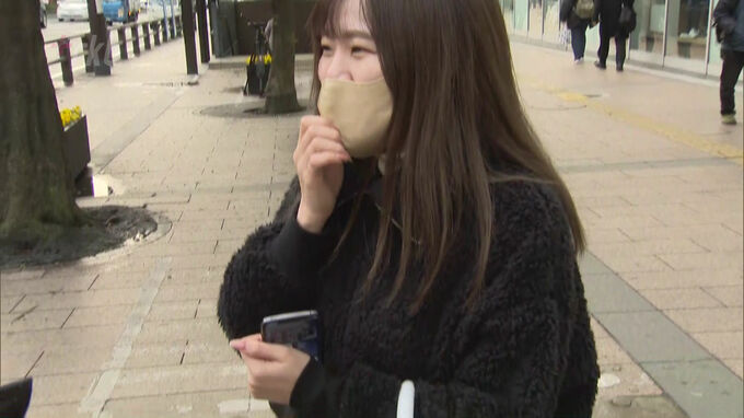RKB吉松真希「午前9時前の天神です。雪が降り始めました。みなさん足早に出勤しています」
