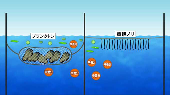 佐賀県小城市の有明水産振興センターに先週、生きたカキが運び込まれました。赤潮を引き起こしたプランクトンをカキに食べさせよう、という作戦です。漁場の支柱に網にくるんだカキを結びつけ、水中のプランクトンを捕食させます。栄養の奪い合いをなくし、ノリの生育状況を改善させようというのです。