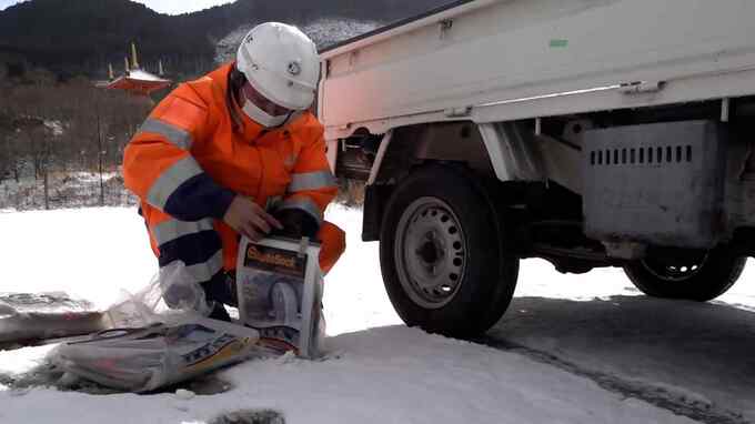 記録的大寒波が襲う中、山の状況は突如として変わった。取り付けたのは、オートソックという布製のタイヤチェ―ン。一時的に、スタットレスタイヤと同じ働きをするそう。