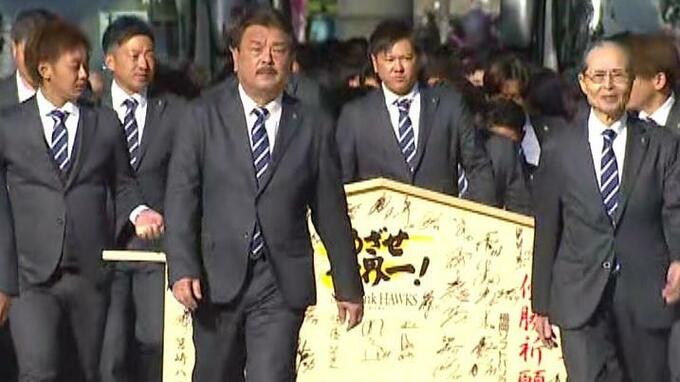 ホークスが必勝祈願 3年ぶりのV奪回を目指す~2月1日から宮崎キャンプ 2023年1月30日(月) 11:37 国内 ホークスは3年ぶりのV奪回を目指し30日、福岡市の筥崎宮を参拝し必勝を祈願しました。午前10時からの恒例の必勝祈願には、首脳陣や選手、球団スタッフが勢揃いしました。王貞治会長と藤本博史監督を先頭に「…