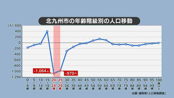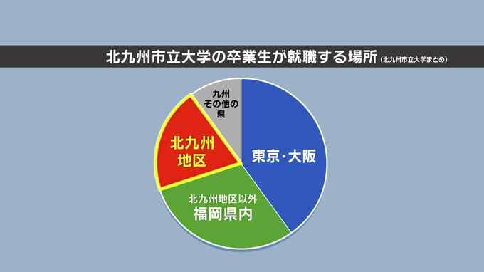 北九州市がまとめた統計です。20代は市外へ転出する人の数が市内に転入する人の数を大きく上回っています。その大きな要因と考えられるのが「就職」です。北九州市立大学では、北九州地区で就職する学生は全体の2割にとどまっていて、多くが東京や大阪、福岡市の企業に就職しています。