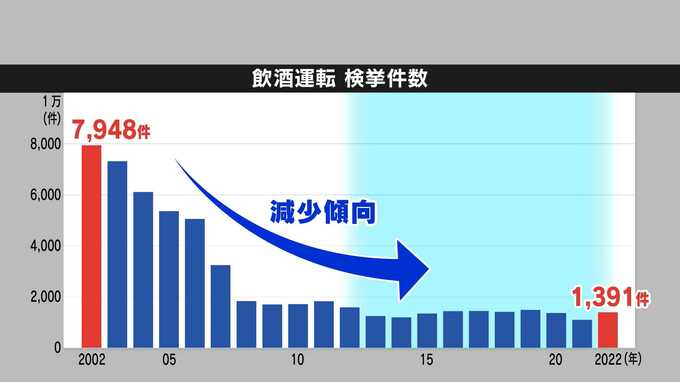 福岡県の飲酒運転の検挙件数は、20年前と比べて5分の1以下に減少したものの、近年は下げ止まりの状況が続いています。