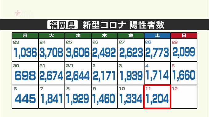 新型コロナ陽性者 福岡1204人 佐賀232人 2023年2月11日(土) 17:55 国内 新型コロナウイルスについて、福岡県は11日、新たに1204人の陽性を発表しました。佐賀県では232人が陽性です。福岡県の1日ごとの陽性者数を示すカレンダーです。11日は1204人で、前の週の土曜…